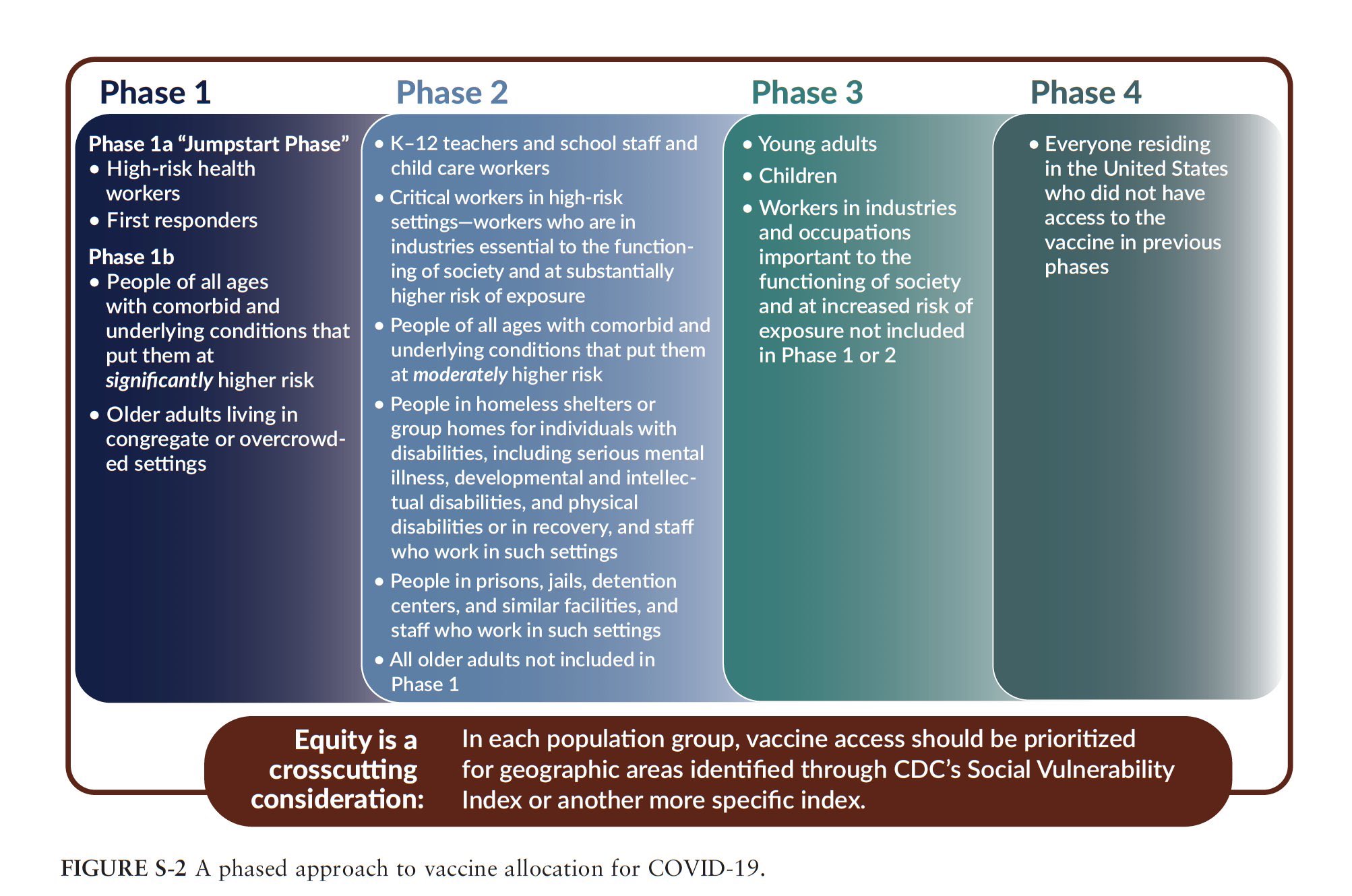 Las vacunas tendrán que administrarse en distintas fases. La CDC americana publicó en noviembre una posible planificación de fases de vacunación, empezando por las personas con más riesgo y más expuestas, hasta acabar por la población que menos riesgo podría tener.